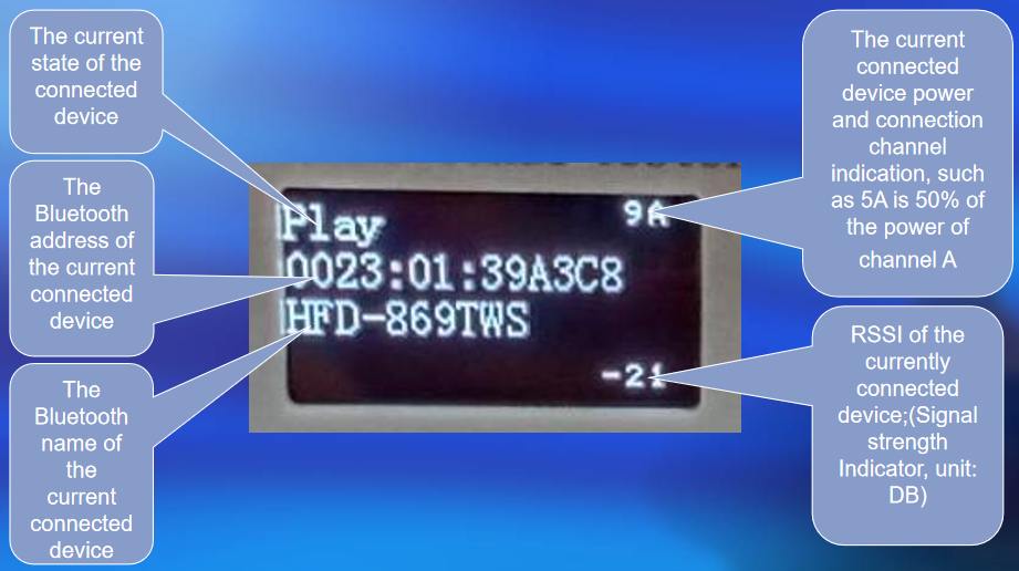 2、距离-按钮:连接距离减少; 3、通话模式按键:在连接的蓝牙设备播放音乐的界面,按一下切换键,蓝牙耳机或者音箱上可以听到数字信号数字(0-9),可以使用耳机或者音箱的接听键接听电话或者第二次按切换键接听电话,进入通话后,你可以对着自己的麦克风讲话,耳机的音箱可以听到自己的声音,这样就可以测试头戴式耳机了; 4、小米头显模式键:在当前显示界面按切换键直接进入小米头显模式,小米头显测试完成后按通话模式键或者按蓝牙耳机或音响上的挂机键退出通话,回到音乐播放模式; 5、重置键:短按更改键,将断开当前显示界面的蓝牙设备; ![]() 天线: 1:RF-A天线接口:接模块发射电源天线; 2.Rf-b天线接口:B模块发射功率天线; 电源接口: DC-5v输入接口:MINIUSB供电接口,输入电压5V/2A,尽量使用原装适配器; TF卡接口: 蓝牙耳机或音响在音乐模式下的音乐接口,带128M MEMORY TF卡,内含说明书,测试音乐等 音频接口: 1:HFP-in:通话时,可以使用语音输入进行攻击测试; 2:H2DP_IN:默认TF卡音乐,当插入音频线时,第一个默认为外部音频输入; 3、Hfp-out:通话过程中,当耳机或者3.5音频线插入修改后的接口时,通话声音不会传回,通话声音从修改后的接口输出; 4、HFP_VOL:改变旋钮开关左右旋转改变通话音量,仅对通话音量有效; 5.A2DP_VOL:改变旋钮开关左右旋转改变音乐音量,对音乐和通话音量均有效; 指示: 1、接通DC5V电源,按开机键,显示屏亮,连接A与B,指示灯闪烁,测试仪自动搜索蓝牙设备。 2.将所有需要测试的产品放在测试站的蓝牙上,将A和B连接起来,指示灯常亮,两个蓝牙产品连接成功。LCD显示产品状态,地址,蓝牙名称。此时蓝牙会自动播放音乐。此时将开始测试,播放/暂停,通话/麦克风性能测试。操作蓝色屏幕将切换到“当”为上一首/下一曲,播放/暂停,通话/麦克风预操作蓝牙产品状态。以当前状态优先测试麦克风通话。 3.两个测试位之间应相隔3m距离,或标准时间内3m,对于蓝牙产品在3m以外,请将仪器“信号强度距离设置”键设置为适当值。此时测试仪会将蓝牙产品三米以外的时间延长或断开连接状态。此值不大,可以设置到底,会影响蓝牙连接。若测试位蓝牙在标准时间内未连接,请将仪器“信号强度距离设置+”键适当增大该值。 4.麦克风及电话测试时:产品已经定义了播放键启动电话重拨功能,直接操作产品即可完成电话重拨测试。即双击或者长按播放键,再按接听键,您的产品就会自动进入电话重拨测试。对于没有定义电话重拨功能的产品,按测试仪上的通话模式键进行测试,测试仪会自动给您的产品发一组电话铃声,再按接听键即可进入电话重拨模式;还有一种产品没有播放键(接听键)。只需要按麦克风类型键即可进入通话测试;此时LCD会显示相应状态并对着麦克风讲话即可测试产品,扬声器会播放扬声器的声音。可以外接通话口安装耳机或者有源音响,声音非常清晰。5.测试麦克风与电话功能。关闭蓝牙产品。拿起第二个设备,立即开始测试第二个产品,同时测试仪已自动开始自动搜索第三个产品,台湾产品。如此等等,如此等等。 应急问题解决合集: 1:开机没有通电或者指示灯不闪? 首先检查电源开关指示灯是否亮,如果屏幕亮但是指示灯不闪,一定要先关闭电源开关再开机,然后插上USB电源开机看问题是否解决。 2:灯闪但是连接不到蓝牙设备? 首先检查机器的距离,将机器的距离调大到95,然后搜索设备看问题是否解决。 3:蓝牙连接了,没有音乐? 首先旋转TF卡旁边的音量旋转键,看看有没有音乐声音;其次检查TF卡是否松动,拔出TF卡,重新插入TF卡看问题是否解决。如果还是没有音乐,请插上TF卡,关机,重新插上USB口,重新连接蓝牙设备。细心注意,TF卡音乐都是单声道音乐,首先你确定你的产品是立体声的,或者按产品的下一个功能看看是否有音乐。 4:打电话并尖叫? 由于不同的蓝牙方案,蓝牙麦克风的增益不同,所以需要旋转HFP_VOL旋钮来调低通话音量。 5:手机没有声音? 旋转通话输出旁边的音量按钮,查看是否有通话声音; 6:音乐噪音? 首先旋转TF卡旁边的音量旋转键,调节音量到合适的位置,因为每款产品的增益和音频曲线不一样,音量过大可能会导致声音异常,刺耳。 |